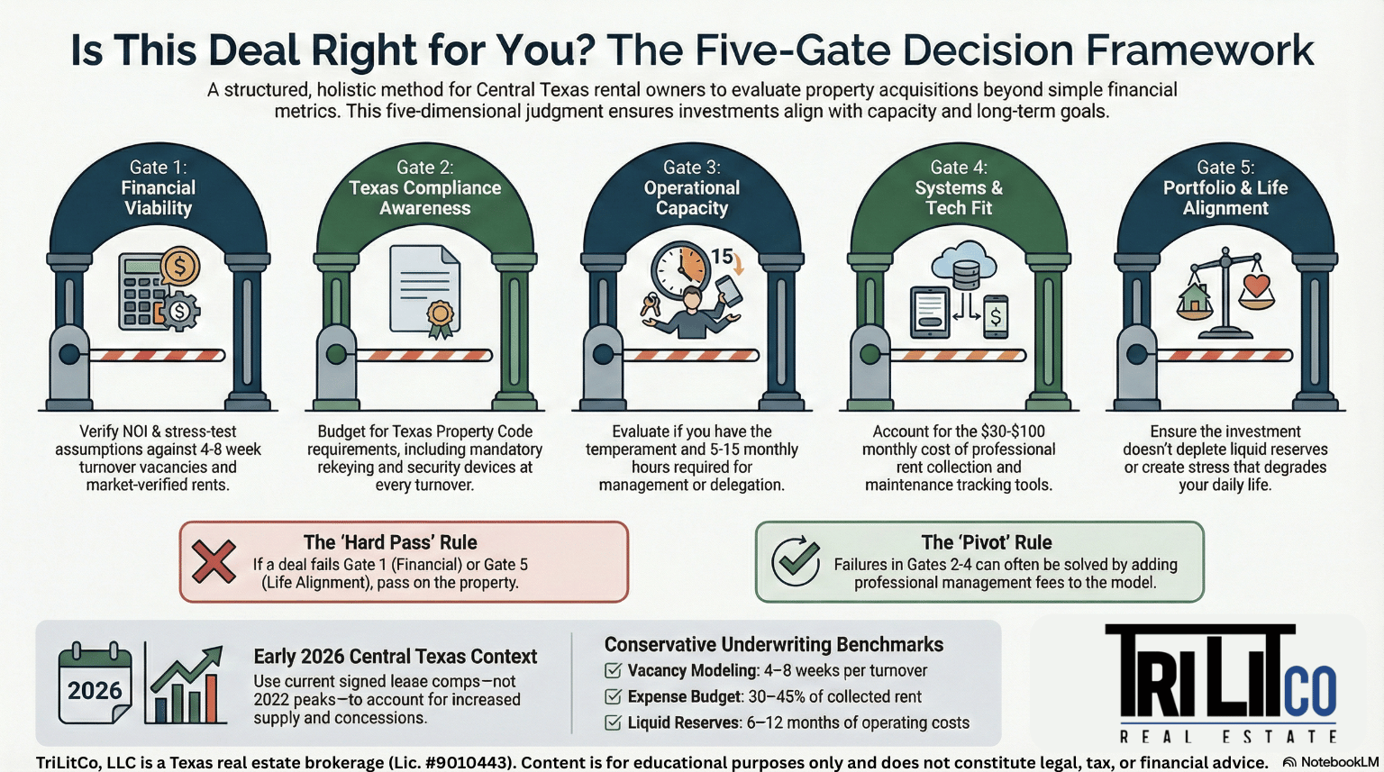 A property can pass one test and fail another. Financial viability without operational capacity leads to burnout. Strong operations without compliance awareness leads to legal exposure. Strong financials without life alignment degrades quality of life.